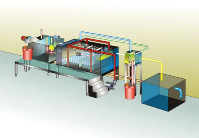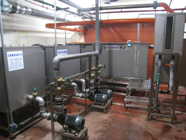 - 第三槽為排放槽。排放水由截油槽流入後,經水位緩升器排放。此緩升器可降低水位瞬間上升,有效控制液位,減少污水擾動,減少懸浮物流出。